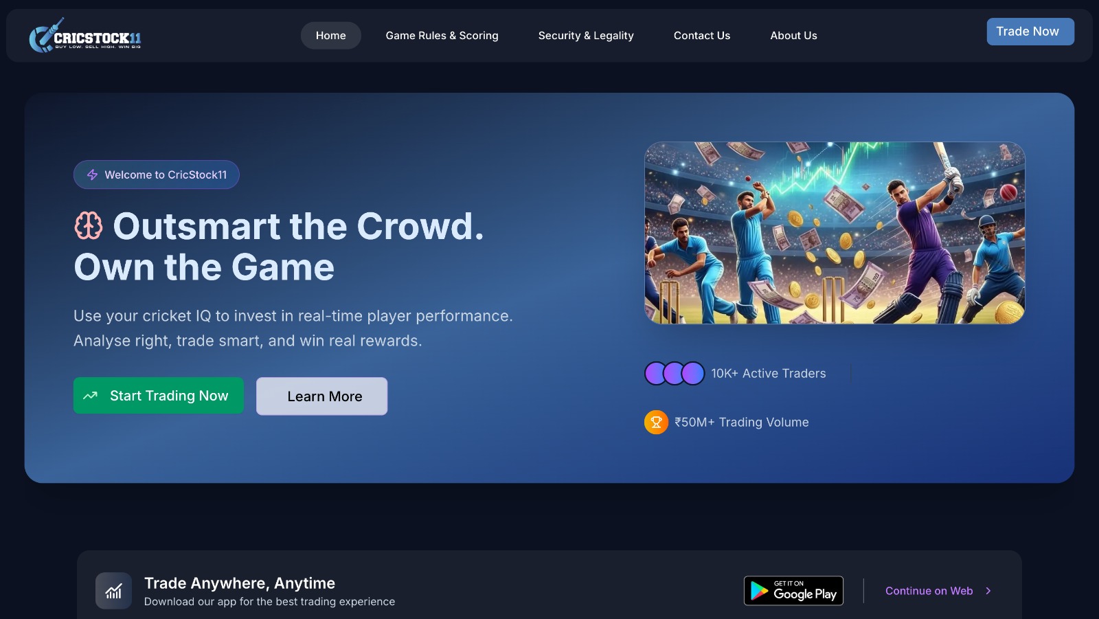 A fantasy cricket platform that simulates a stock market where player values change in real time based on live match data.